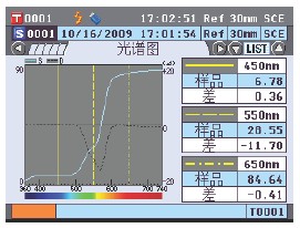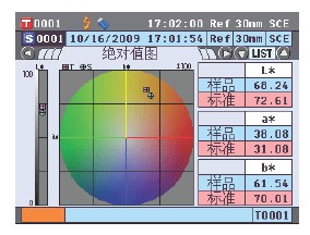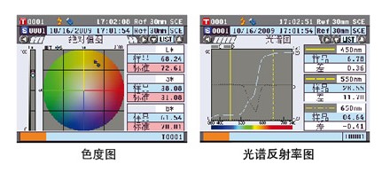 点测量按钮即可,CM-5宽大的彩色LCD屏幕会显示出测量结果,不仅如此还可以显示色度图、光谱曲线等这些以往只有通过电脑软件才可以进行显示的分析图表。
