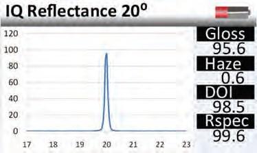 镜向光泽度-该仪器显示的是表面17-23°的反射面。图中曲线的形状描述了光和表面的相互影响。接近镜面的曲线的急转弯说明了表面光滑的高反射。